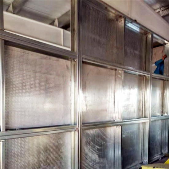 廠家生產的防爆墻采用的是層層結構組和而成的,防爆墻的中間一層采用的是纖維水泥板,表層結構為鍍鋅鋼板,表層鋼板之間有一定的間距,然后在面板上打出圓孔,打孔的時候把孔內的鋼板打出鋸齒狀,然后一直到中間的纖維水泥層,然后用壓力壓緊。